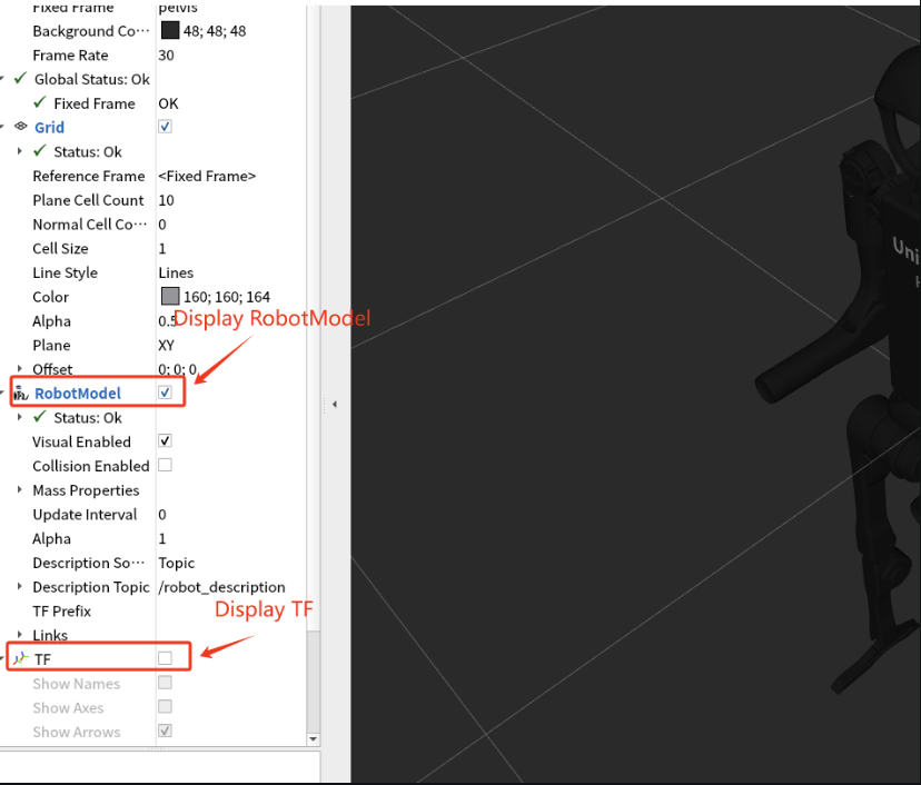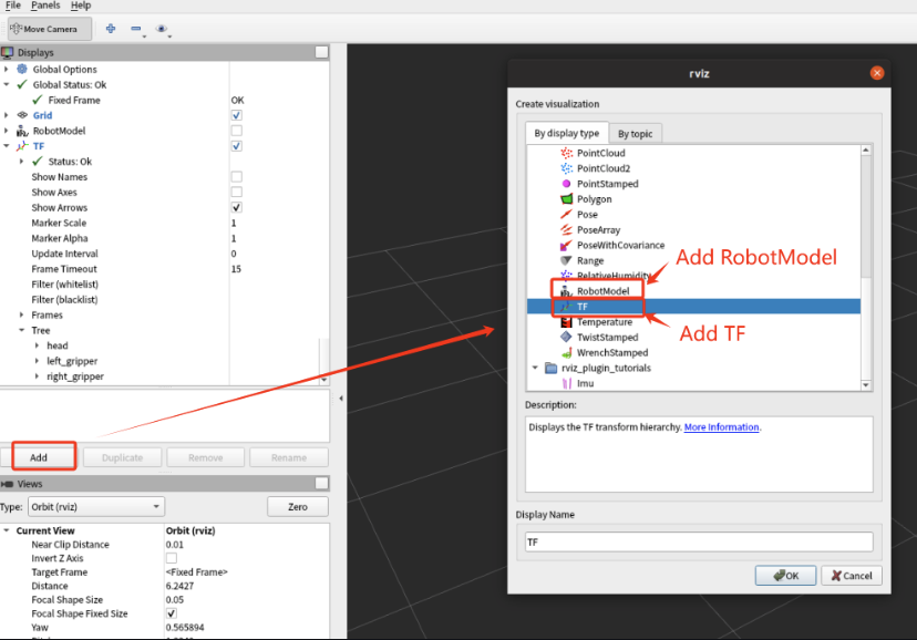 在节点开启后,先通过下面图示来添加模型(”RobotModel” for the robot model or “TF” for the stickman model)