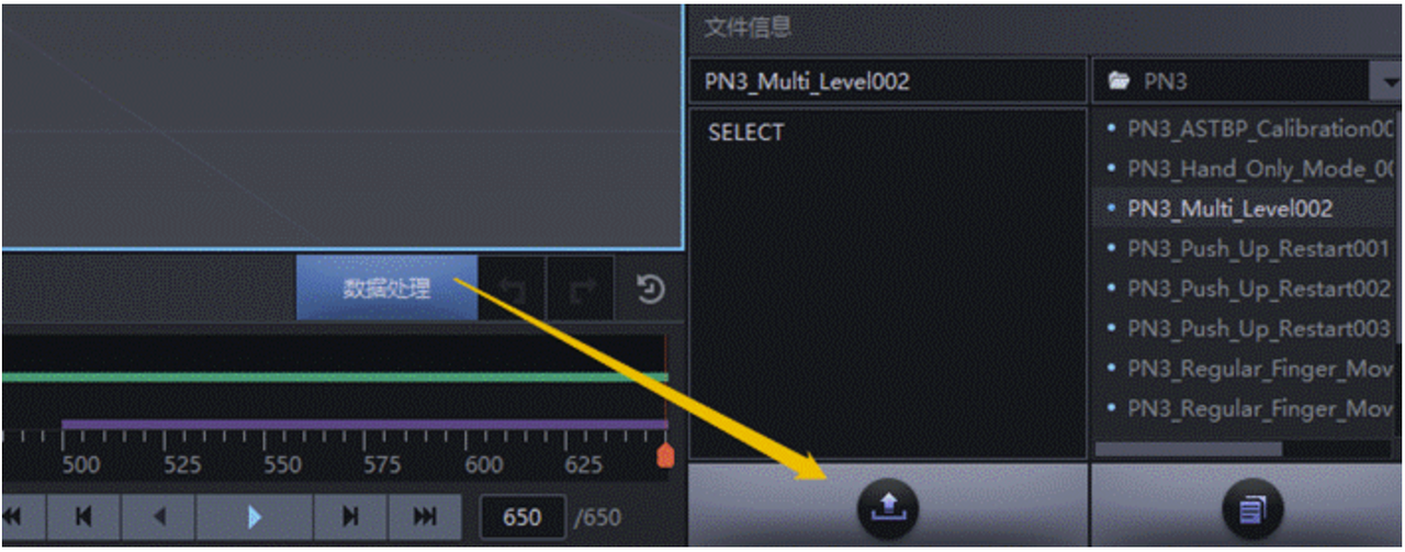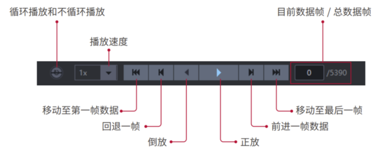 选择了工程里相关的文件后,软件会自动切换到正上方的”编辑“ Tab里,进行数据的3D回放。软件底部有一个数据回放的播放按钮功能条,具体功能如下: