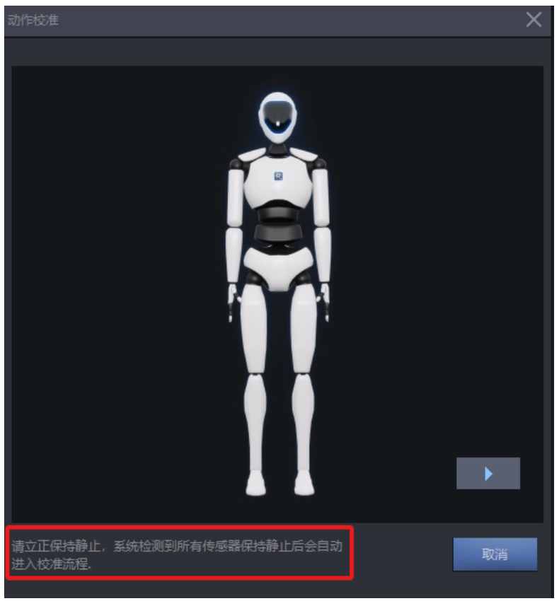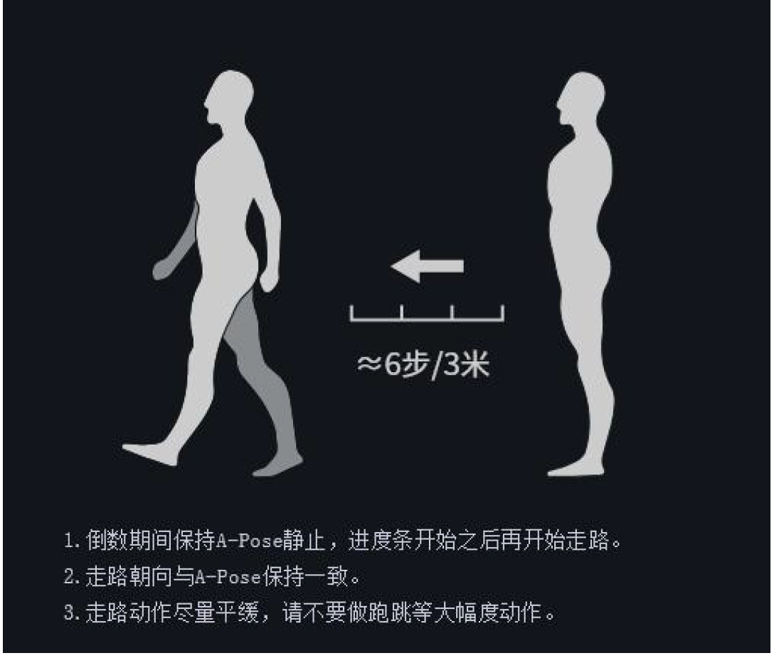 F-pose: 向前自然走出2-3步,转身返回起点A-Pose 站立,直到软件提示“正在计算校准结果”后可自由活动。此动作对于走路姿势没有严格要求,轻松自然走路即可,不要使劲跺脚、跳跃或快速奔跑。