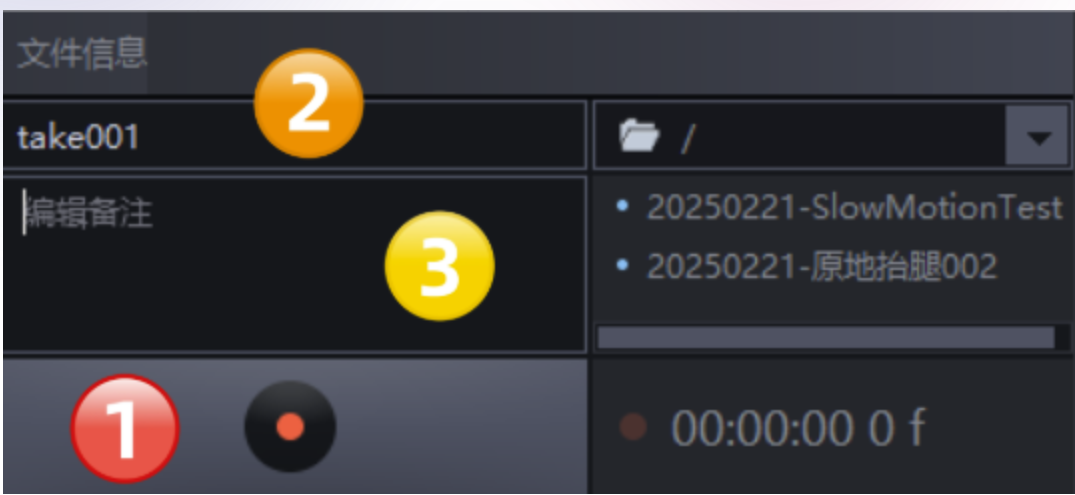 下图的1~3分别为:数据录制按钮、数据名称、数据备注信息