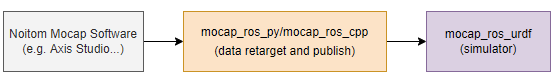 - 将BVH数据跟机器人的关节模型进行映射。比如上面的mocap_ros_py与mocap_ros_cpp,实现的ROS节点程序。它从Noitom Mocap软件中检索数据。重定向后,它将数据发送到模拟器以驱动机器人模型。或者,它可以直接发送BVH数据来驱动TF模型(stickman)。