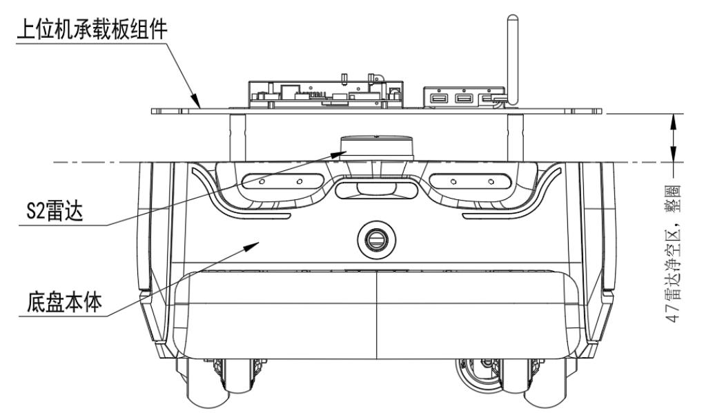 - S2 2D激光雷达(RPLIDAR S2P) 需要留一个S2 2D激光雷达的净空区:底盘本体和上位机之间有激光雷达,其需要一定的净空区以避免被遮蔽或者干扰