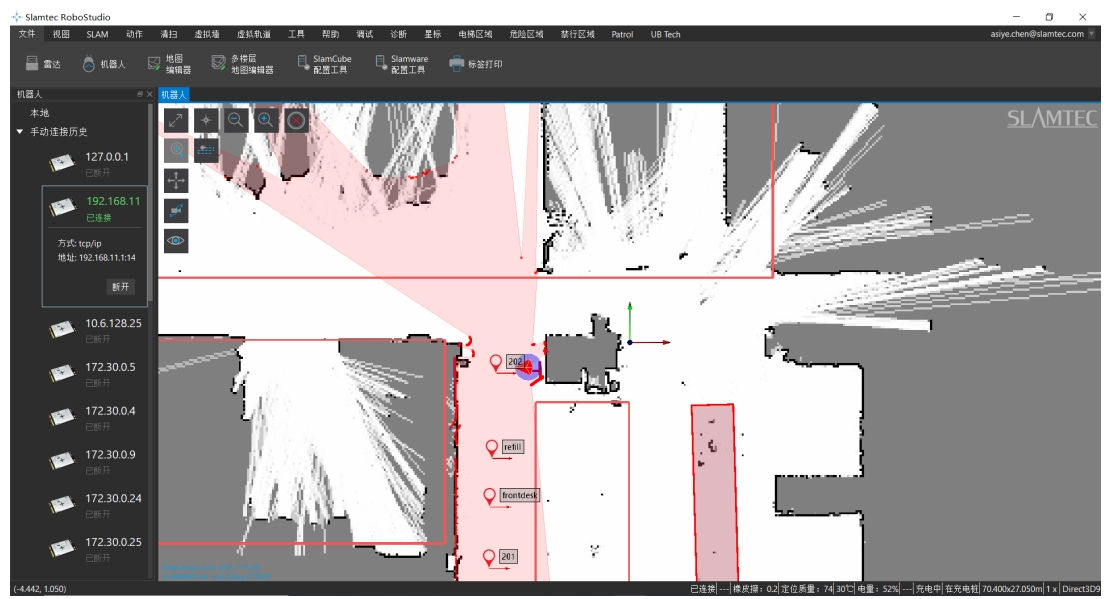 - 虚拟墙:当人为不小心把 Hermes 推进虚拟墙时,在 RoboStudio 中随意给一个定点,Hermes 机器不能自动从虚拟墙中脱困出来,需要人将其推出来。