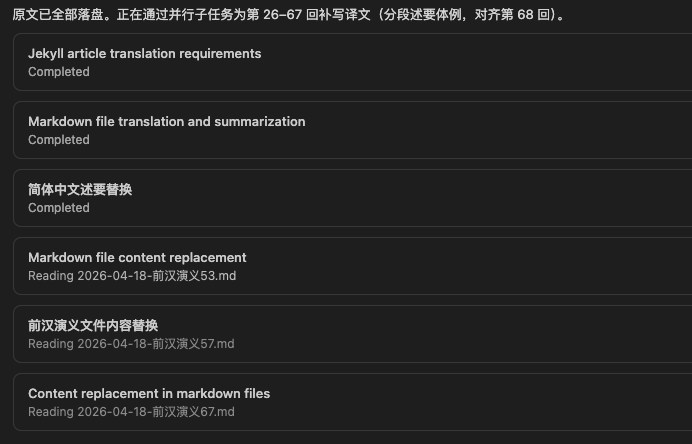 写入路径:_posts/前汉演义/2026-04-18-前汉演义XX.md(XX 为两位回次)。再次运行会整文件覆盖,若已手写译文请先备份或改脚本逻辑。
