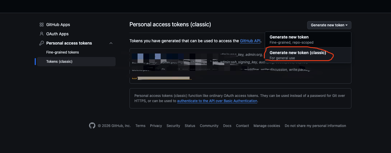 首先进入github的个人设置 Account -> Settings -> Developer Settings -> Personal access tokens -> Tokens (classic)