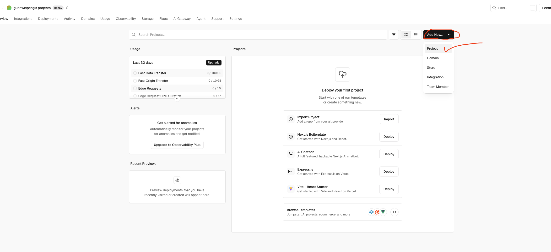 然后fork仓库,再回到Vercel dashboard,点击Add New...