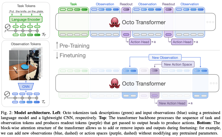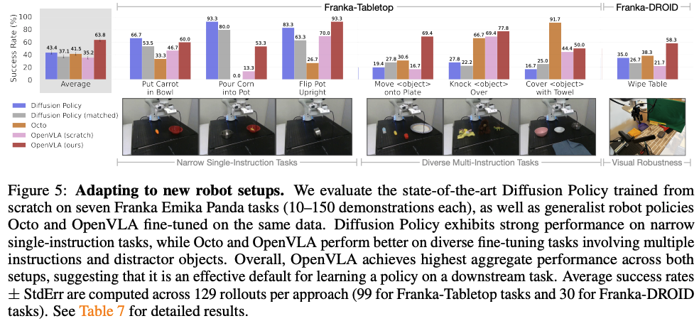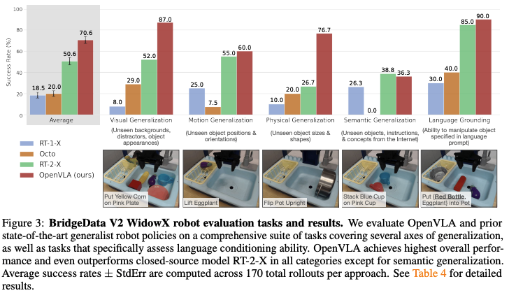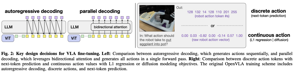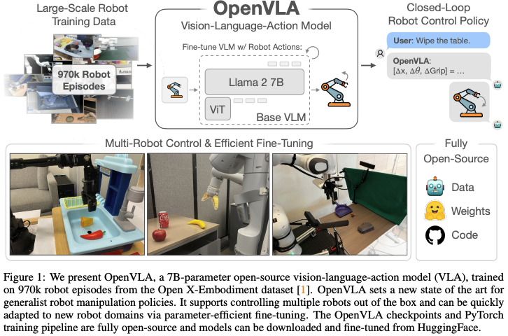 | 2024 | Stanford | OpenVLA | SigLIP与DNIO-v2作为视觉编码器,大语言模型(LLaMA2-7B)作为高层推理 | 首个全面开源的通用 VLA 模型,结合多模态编码与大语言模型架构;首次展示了通过低秩适应(LoRA)和模型量化等计算高效的微调方法,实现降低计算成本且不影响成功率 |