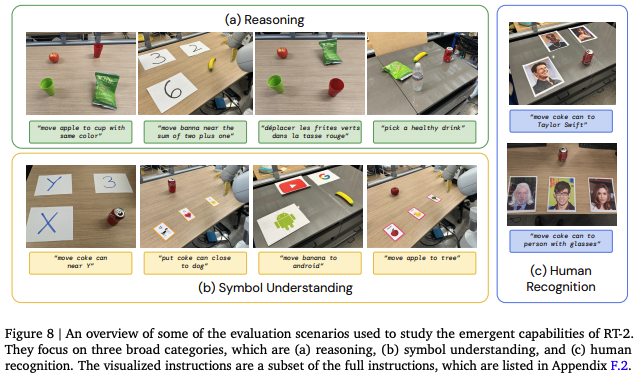 - 卓越的语义泛化能力:得益于背后的大语言模型(LLM、VLM)与大规模视觉-语言预训练,VLA模型具备出色的推理和泛化能力。它不仅能理解指令的字面意思,更能捕捉其背后的隐含逻辑。例如,当被要求“让房间更整洁”时,模型可以推理出需要将散落的玩具放入收纳箱、将书本放回书架等一系列具体动作,而无需对每一种物品和场景进行单独编程。