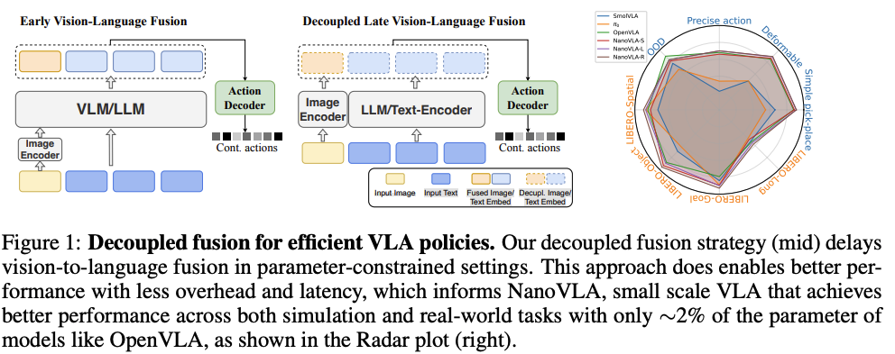 - 视觉-语言解耦(Vision-Language Decoupling):传统 VLA 模型的致命缺陷是 “每次控制步骤都需重新计算视觉与语言特征(forcing the language backbone to recompute at every control step,even when the instruction remains the same)”,而 NanoVLA 通过 “解耦架构 + 缓存机制”,彻底消除冗余计算。将传统的VLM中视觉和语言的融合从早期融合推迟到后期阶段,这样可以避免指令部分的重复计算;