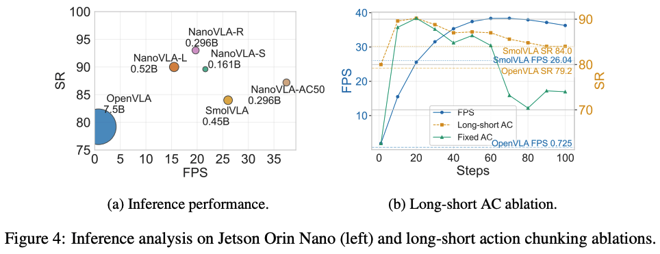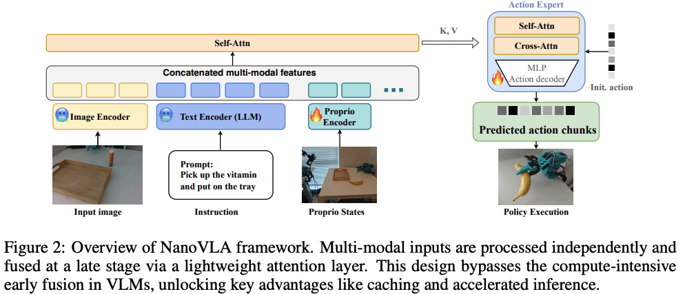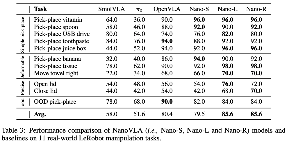 | 2025 | University of British Columbia | NanoVLA | VLM+action expert | 视觉-语言解耦(后期融合+特征缓存)+长短动作分块+自适应选择骨干网络;首次实现在边缘设备(Jetson Orin Nano)上高效运行VLA |