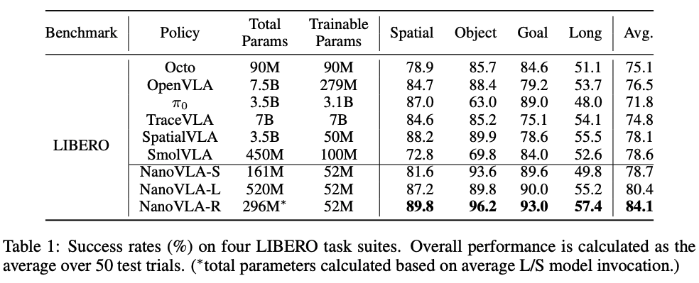 - 在LIBERO任务中,NanoVLA始终优于Octo、OpenVLA、πo、TraceVLA和SpatialVLA等数十亿参数的VLA模型。比 7.5B 参数量的 OpenVLA 高 7.6%,比 450M 参数量的 SmolVLA 高 5.5%;推理速度是 OpenVLA 的 52 倍,是 SmolVLA 的 8 倍,完全满足边缘设备实时性要求(≥10 FPS)。