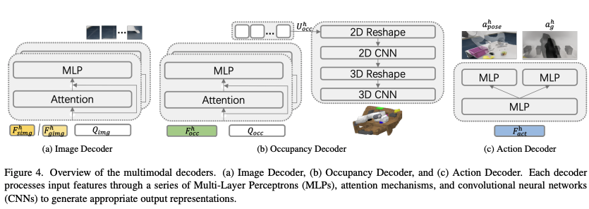 - 多模态解码块(Multimodal Decoders):通过多模态输出增强模型的细粒度感知(fine-grained perception)和理解。所谓的多模态解码器(如图4所示),作者是根据不同的模态设计来对应的解码器:image、occupancy、action