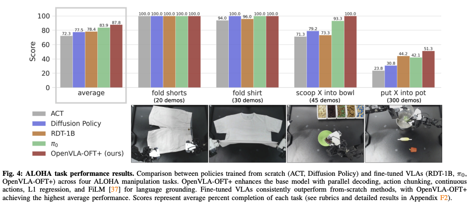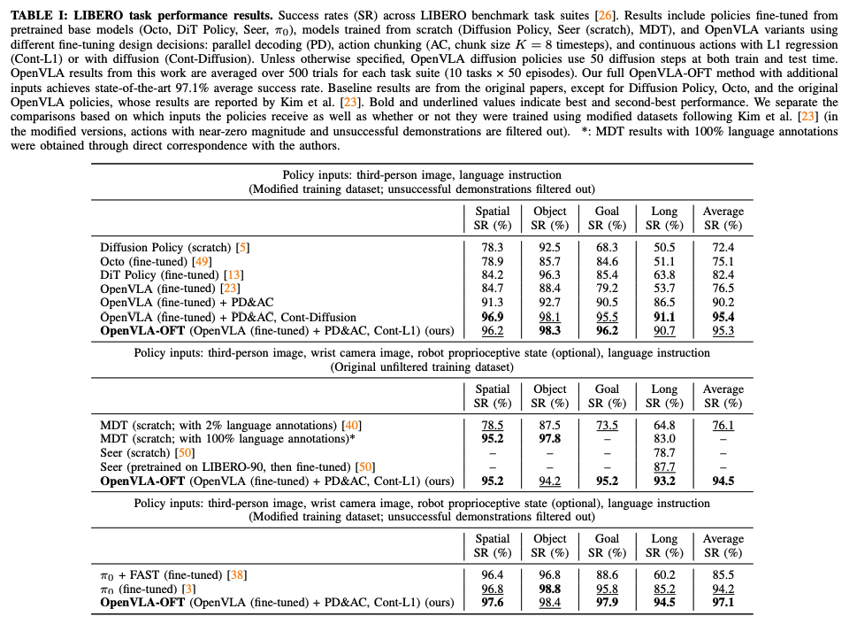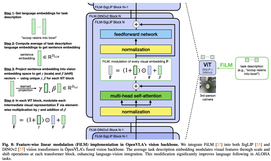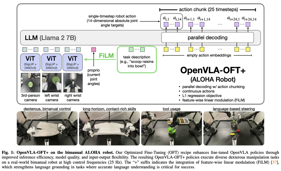| 2025 | Stanford | OpenVLA-OFT/OpenVLA-OFT+ | ViT+LLM | 在OpenVLA基础上引入了并行解码、action chunking、连续的动作表示、简单的L1回归作为训练目标;其中OpenVLA-OFT+则是在SigLIP和DINOv2之间插入了FiLM |