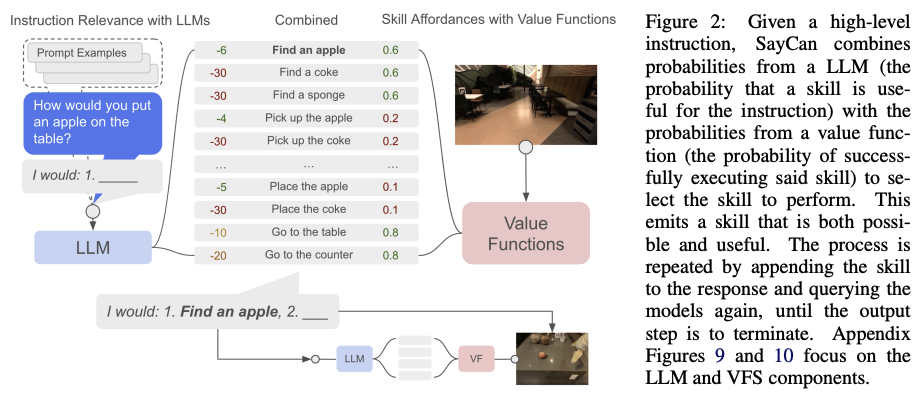 - 所谓的价值函数根据当前场景评估每个动作的可行性。例如,在包含红牛罐和苹果的场景中,“抓取红牛罐”和“抓取苹果”这两个动作会被赋予较高的价值;而在空旷场景中,所有抓取类动作的价值则会被调低。