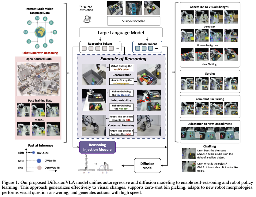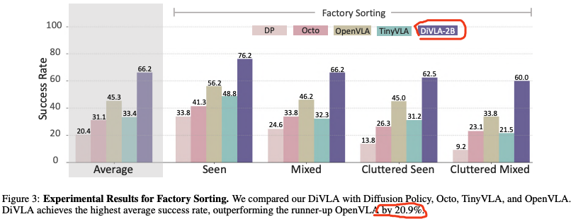 | 2025 | 美的 | DiVLA | VLM+autoregressive+diffusion | autoregressive进行推理,而diffusion进行动作生成以控制机器人 |