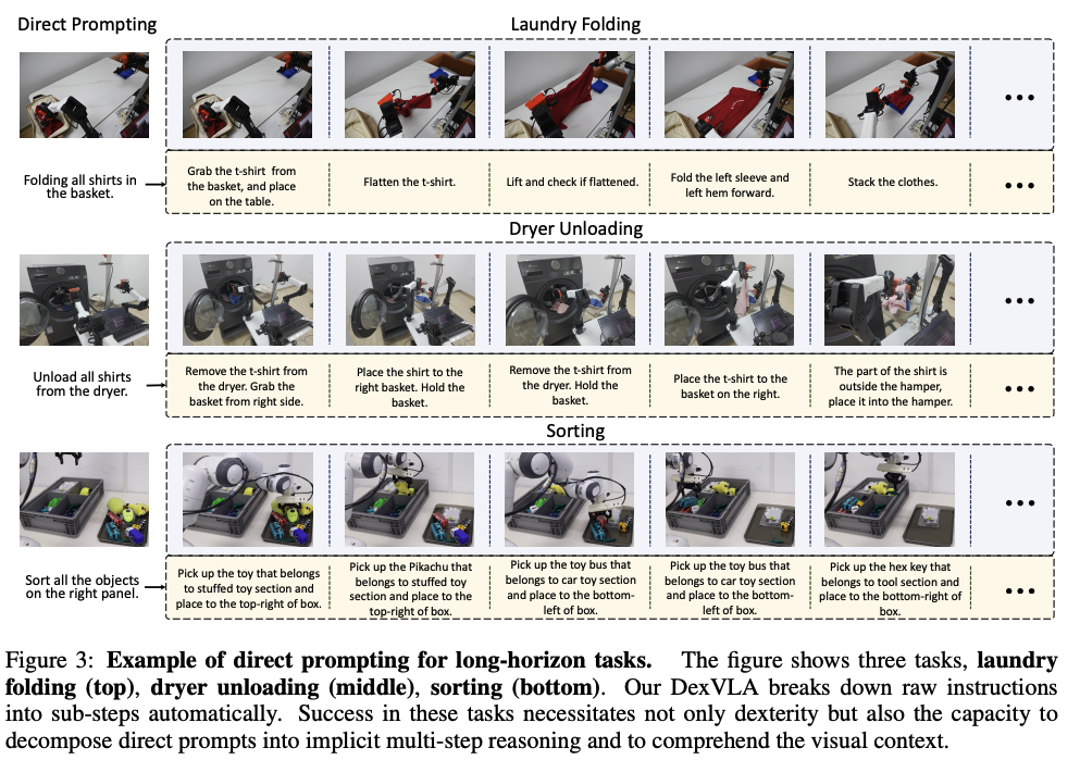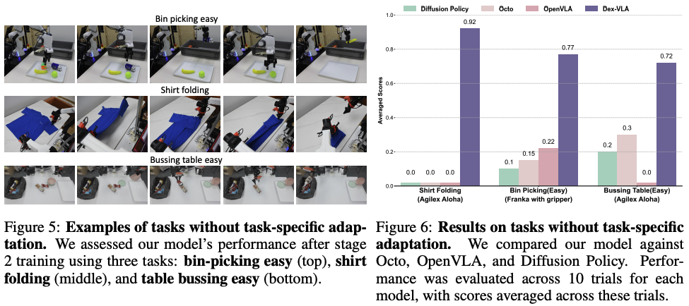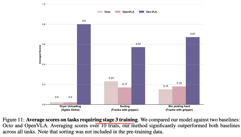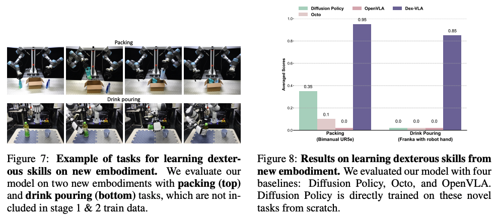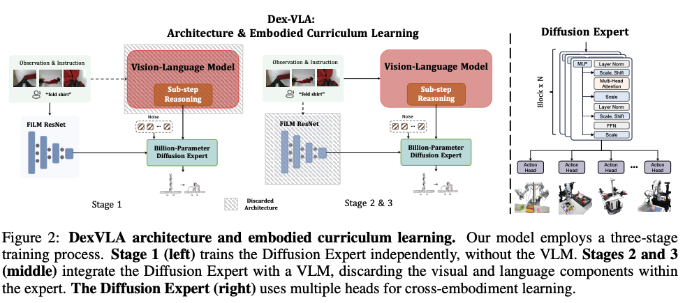 | 2025 | 美的 | DexVLA | VLM+diffusion | 1B参数量的diffusion expert with multi-head架构,实现不同实体形态的学习;三阶段的分离式训练策略; |
