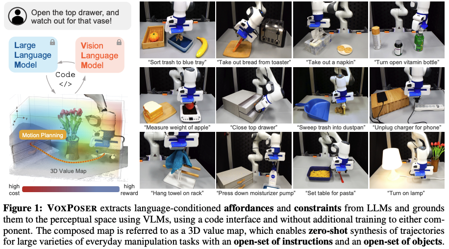 | 2023 | Stanford | VoxPoser | LLM+VLM | LLM进行代码生成驱动机器人完整操作任务,VLM获取3D价值地图获取实现任务的轨迹规划 |