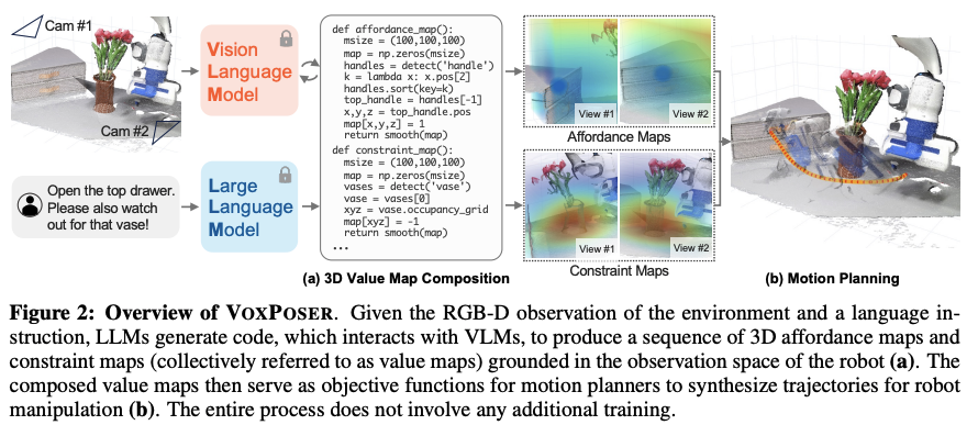 VoxPoser也属于早期的工作,同样的当时VLA的概念还没出来。 LLM虽然已经被证明有大量丰富的actionable知识可以用于机器人操作的推理和规划,但是只能依赖于了预定义的运动(motion primitives)来与环境进行交互。 因此本文首先合成了机器人轨迹(包括六自由度的末端的waypoint),包括了开放的指令和开放的物体。 作者首先发现:LLM在语言指令下擅长推理affordances(可行性) 和 constraints(约束条件),更重要的是利用模型自动生成代码,并结合VLM模型,将自然语言中的可行性与约束条件映射为3D价值地图(3D value maps)。