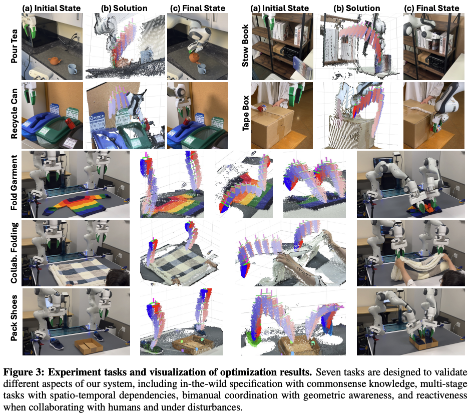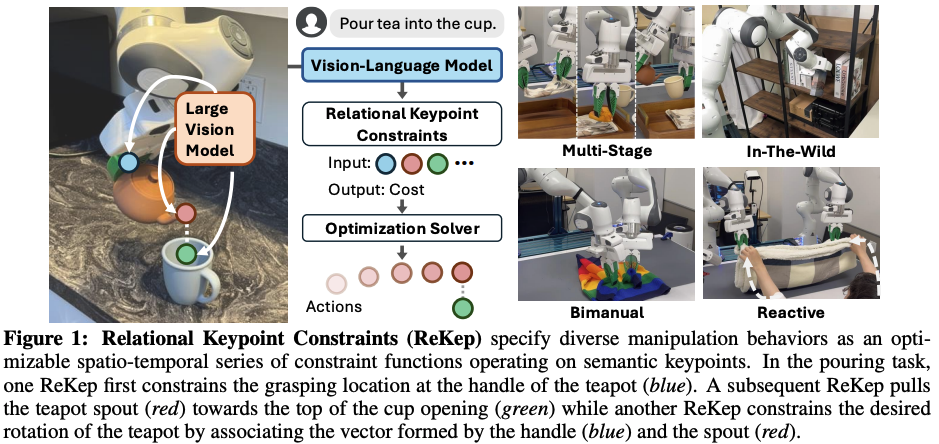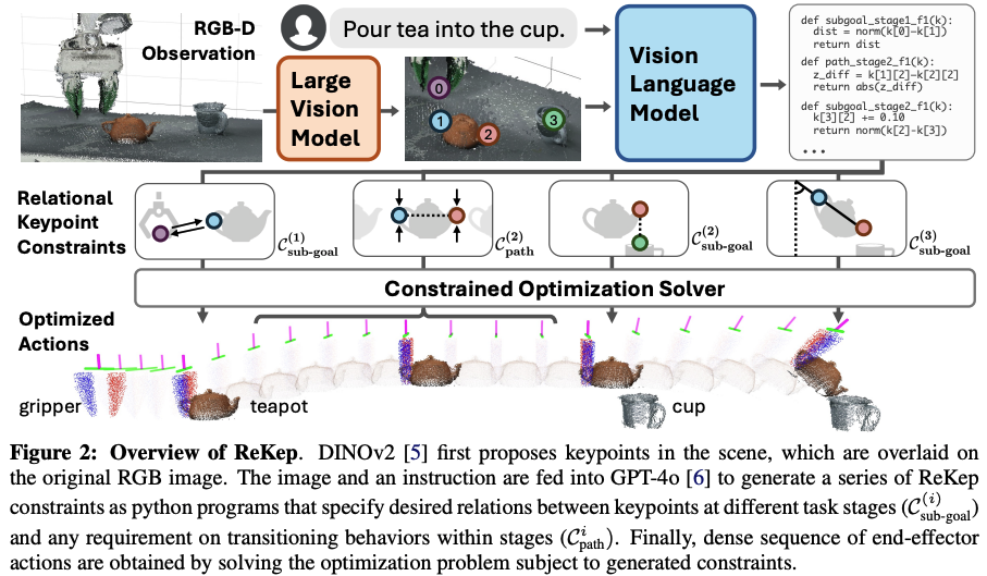 结合视觉模型DINOv2和多模态大模型GPT-4o,将自然语言任务转换为关键点之间的空间约束,通过优化求解生成机器人精确动作。