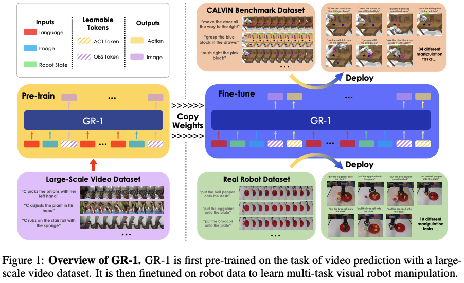 | 2024 | 字节 | GR-1 | GPT-style 视频生成模型 | 通过GPT式生成模型的预训练(video generative pre-training model),结合机器人数据进行微调 |