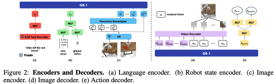 本文也是首次展示同意的GPT类型的transformer通过大尺度生成模型的预训练,可以有效地泛化到机器人操作任务上。 GR-1模型细节如下所示。左侧为输入编码器;右侧为输出解码器,负责动作生成和未来图像预测。