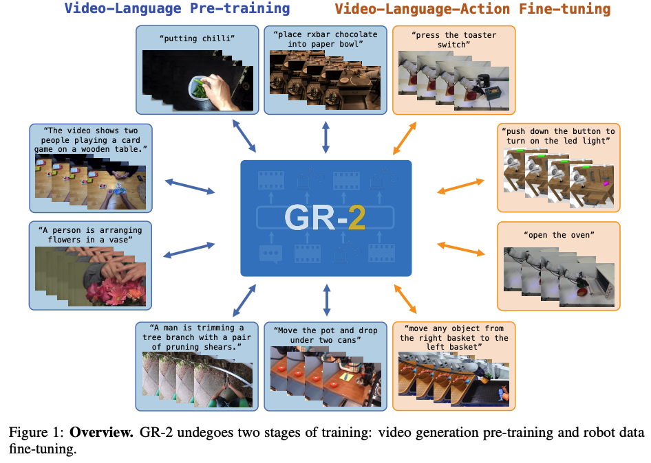 GR-2是GR-1的进化版本(直观来看就是在GR-1的基础上,用了更多的更diversity的数据来预训练)。同样地,也是基于视频生成模型,通过大规模视频-语言预训练(Internet videos)和动作轨迹微调(video generation and action prediction using robot trajectories),进一步提升了机器人多任务操作的精度、连贯性和泛化能力,相比GR-1实现了显著的提升(在超过100个task上的平均成功率达97.7%)。