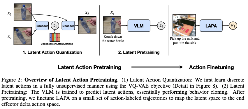 | 2025 | KAIST | LAPA | VLM | 首个通过无监督学习(没有真值机器人action label)来训练VLA模型的方法 |