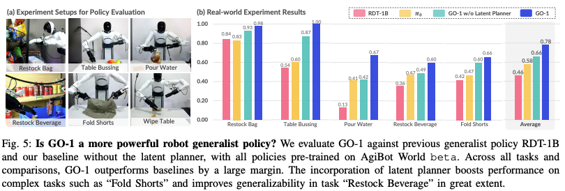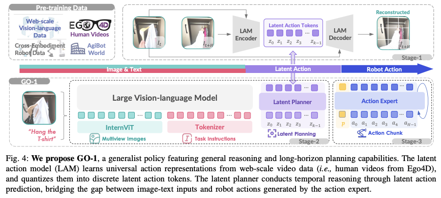 | 2025 | AgiBot-World | GO-1 | VLM+Action Expert | AgiBot World:5个场景下217个task对应的一百万条真实机器人轨迹;通过 latent action representations来提升机器人数据的利用; |