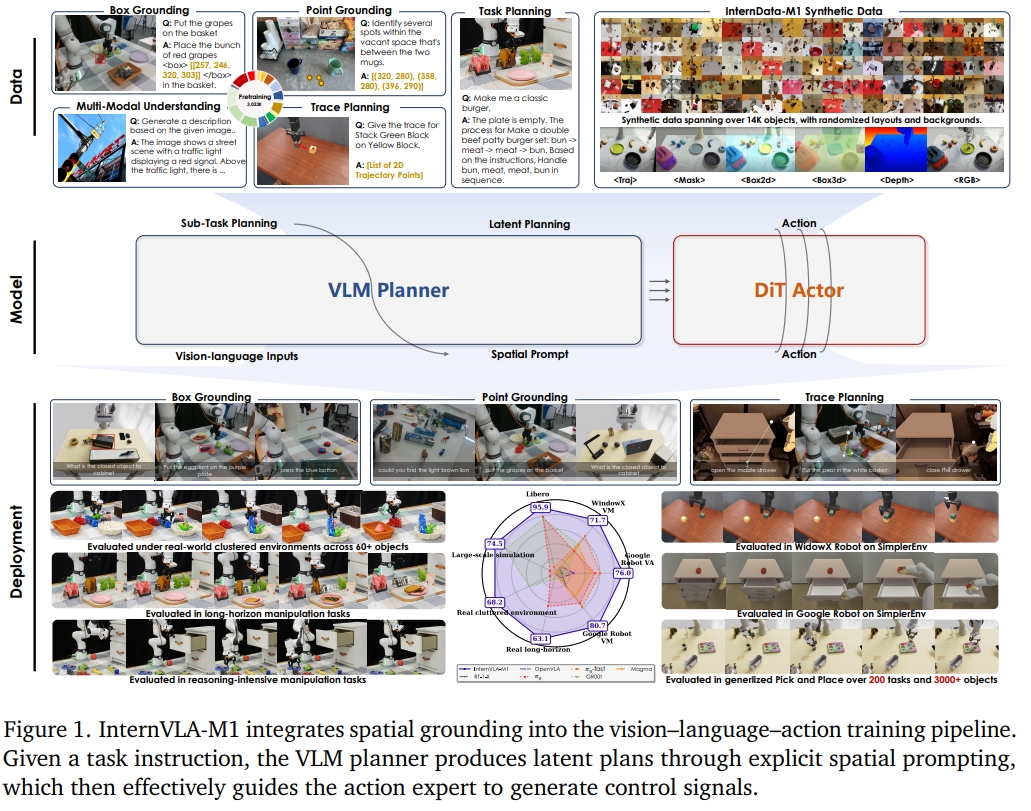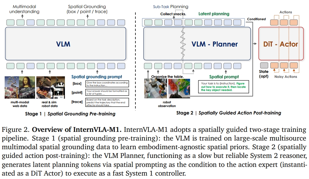 InternVLA-M1架构如下图所示。建立在空间先验VLM planner和action expert(具体化的特定控制/embodiment-specific control)之上的双系统框架,将高级推理(high-level reasoning)与底层执行(grounded execution)相结合。