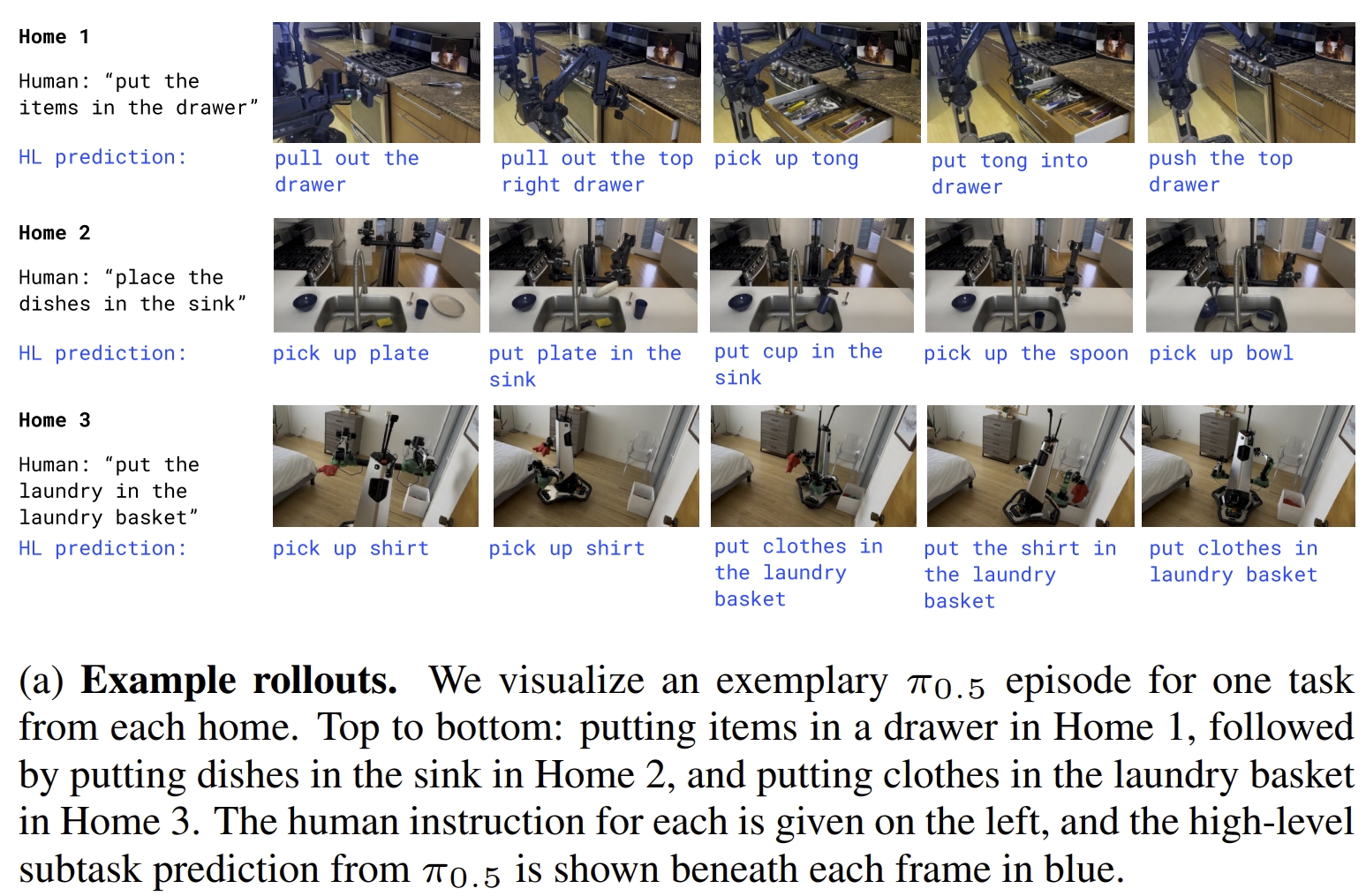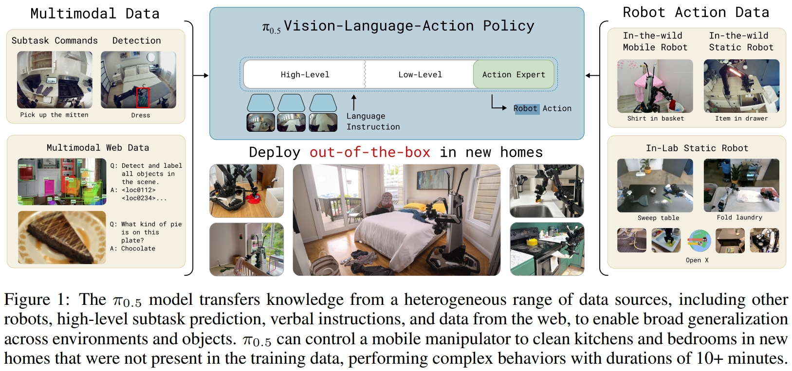 | 2025 | Physical Intelligence | PI0.5 | PI0+PI-FAST+Hi Robot+多源异构数据 | 多源异构数据联合训练+序列建模统一模态+层次规划推理;首个实现长期及灵巧机械臂操作 |