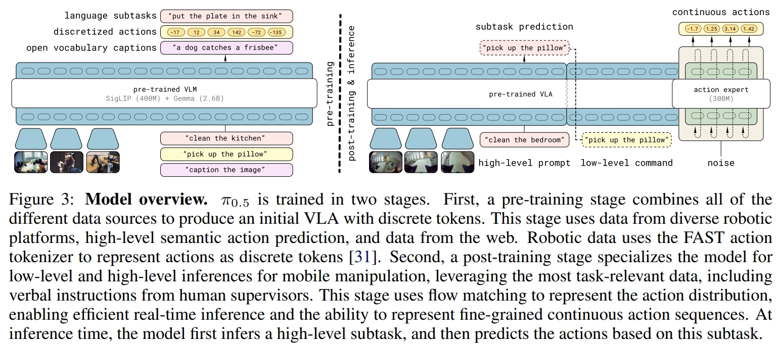 - 空间指导的运动后训练,通过联合监督训练,将先验应用于具体化的特定控制(embodiment-specific control)。Action Expert是基于机器人演示数据训练的,并且是跟VLM一起联合训练。