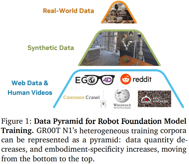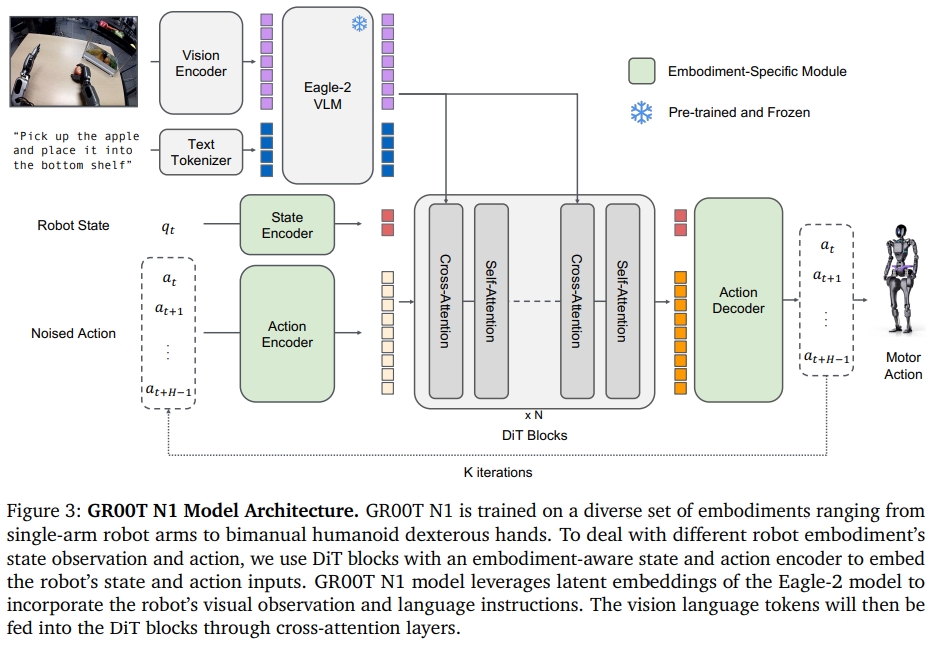 | 2025 | NVIDIA | GR00T N1 | 双系统;VLM(NVIDIA Eagle-2 VLM)+flow-matching训练的Diffusion Transformer | heterogeneous training data |