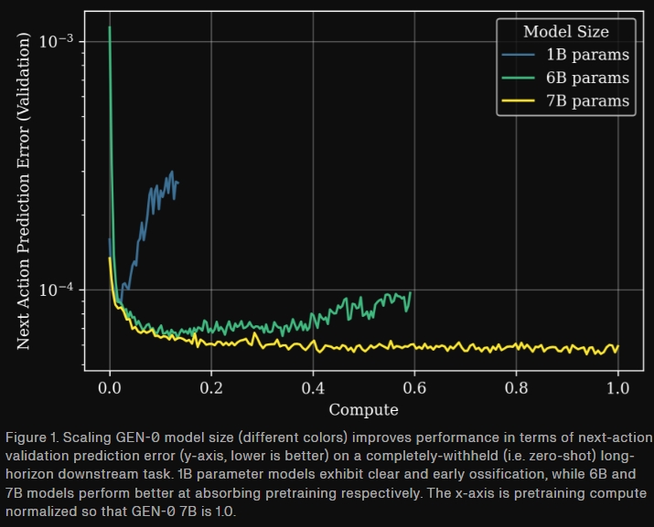 - 超越智能阈值(7B参数量):使用前所未有的大量数据,Generalist 观察到在 7B 参数上出现了一个「相变 (phase transition)」;较小的模型表现出「固化 (ossification) 」现象,而较大的模型性能则能持续提升。Generalist进一步将GEN-0扩展到10B+的模型规模,并观察到它们能以越来越少的后训练快速适应新任务。