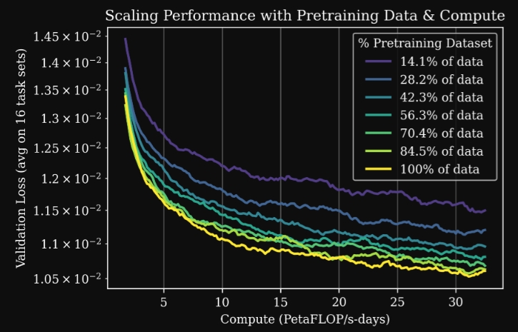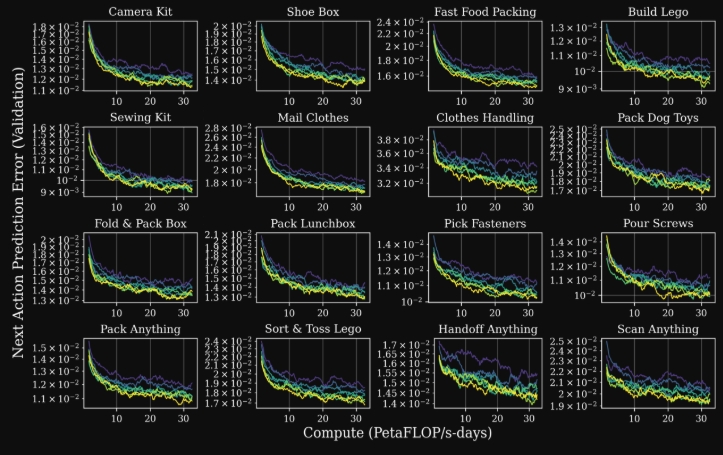 - Scaling Law:GEN-0 模型展现出了强大的 Scaling Law,即更多的预训练数据和算力,能够持续(且可预测地)提高模型在众多任务上的下游后训练性能(post-training performance)。