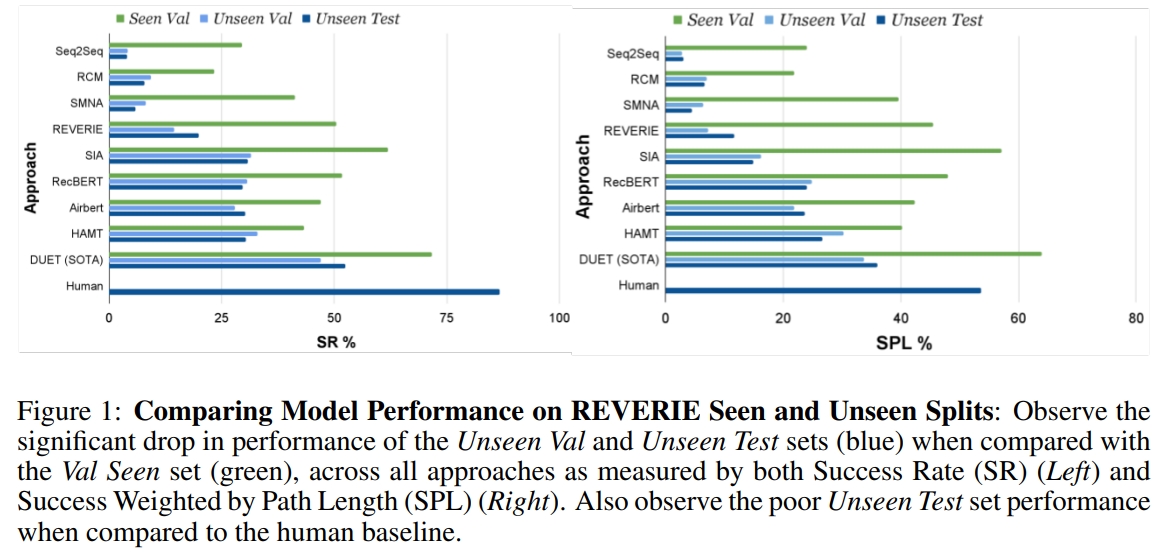 此前的VLN方法都是采用监督学习,模型首先在”seen”环境及指令下训练的,然后在”seen”以及”unseen”环境下验证.这类型的方法没见过的环境中通常有明显的性能drop.如下图所示: