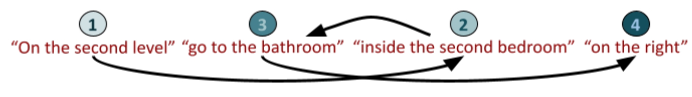 将指令分解为keyphrases后,作者就用于在Matterport3D的导航中,而Matterport3D的每个节点但都是agent的360度的全景图像,而为了选择全景图中的导航方向,作者将其分为4个分开的image,每张图包含了agent大概90度的空间。然后图片分别与语言指令通过CLIP进行匹配,选择匹配最大的为方向。其中AC指令如果超过一定的阈值或满足停止的条件时就会执行stop
