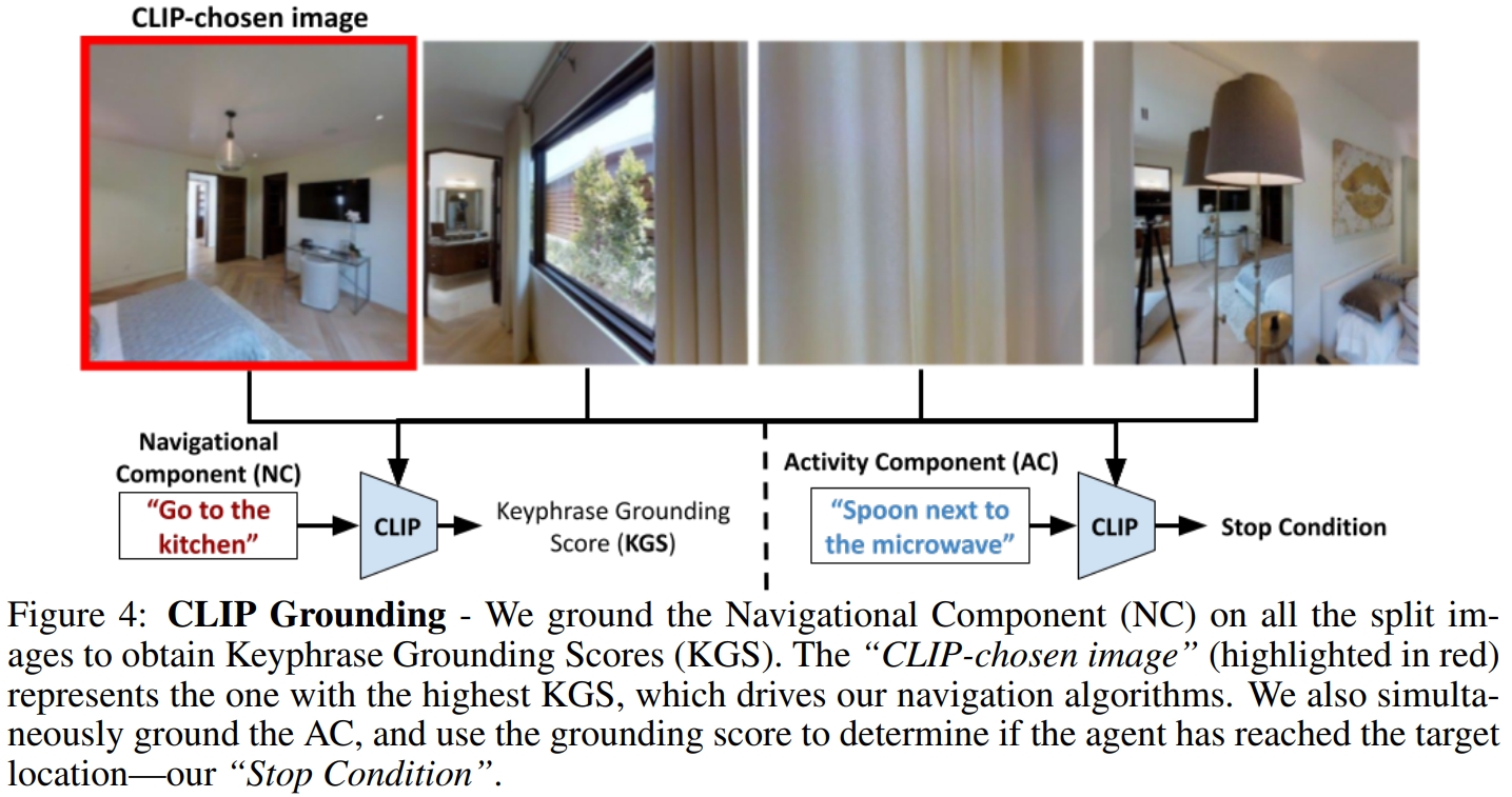 如果 grounding score一直高于一定的阈值,我们就假设agent可以成功导航到kitchen,并且可以执行next keyphrase。因此CLIP不仅仅是选择导航的方向,还是决定agent什么时候到达中间的目标位置。