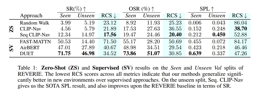 实验测试测试了一系列基于CLIP的baseline的SR和SPL(Success weighted by inverse path length)
