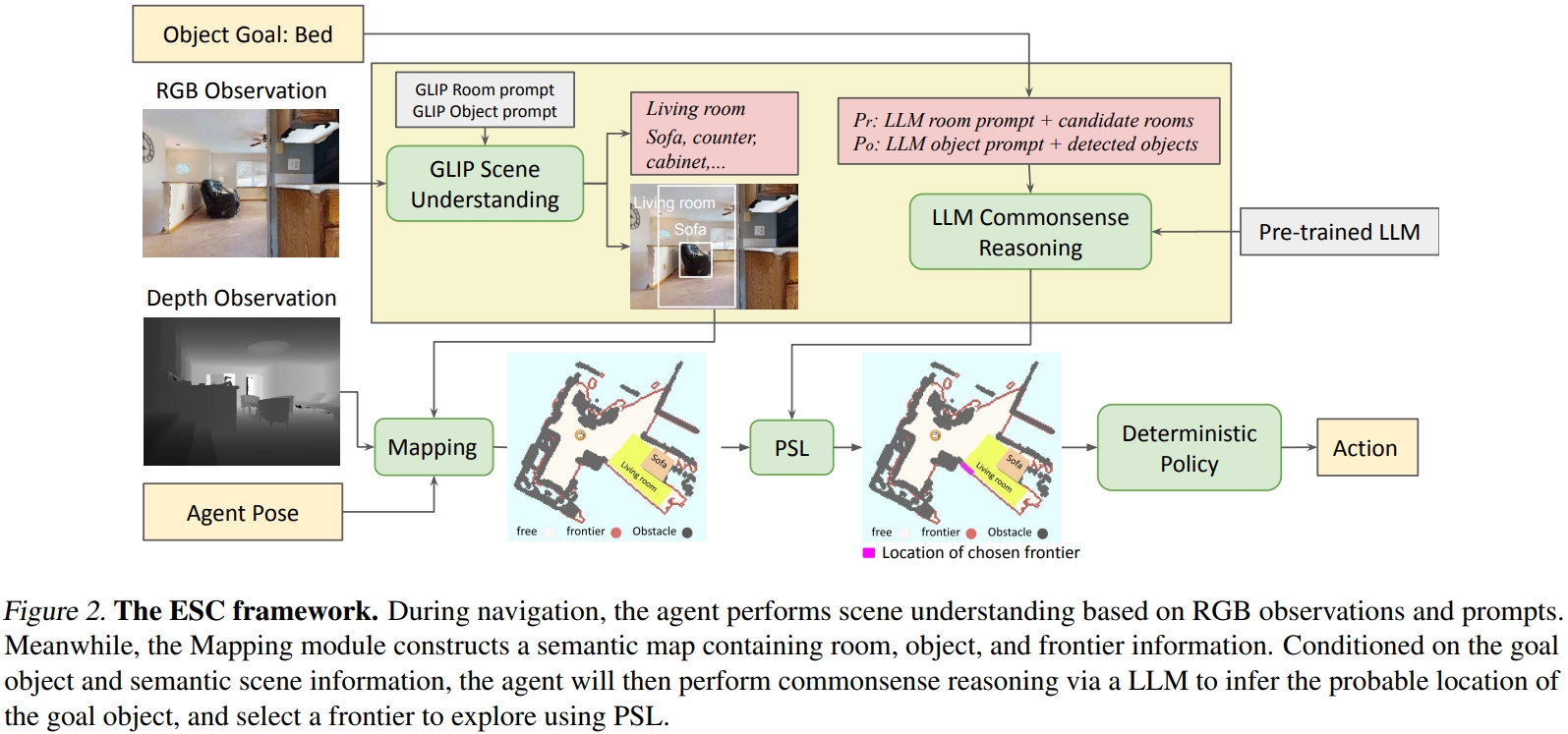 - ESC利用预训练视觉语言模型(GLIP)来做open-world prompt-based grounding(开放世界提示定位)以及采用预训练的commonsense 语言模型来做房间和物体的推理(这部分属于场景理解/scene understanding)。