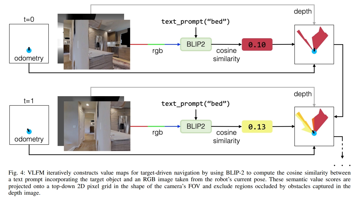 - 对于Value map generation:作者采用预训练好的视觉语言模型,BLIP-2(CLIP的图像到文本检索),来直接从机器人当前的RGB观测以及包含目标物体的txet prompt来计算cosine similarity score。而这个score会进一步的投影成value map。这个值是用作confidence value来辅助frontiers的选择以及目标的定位的。