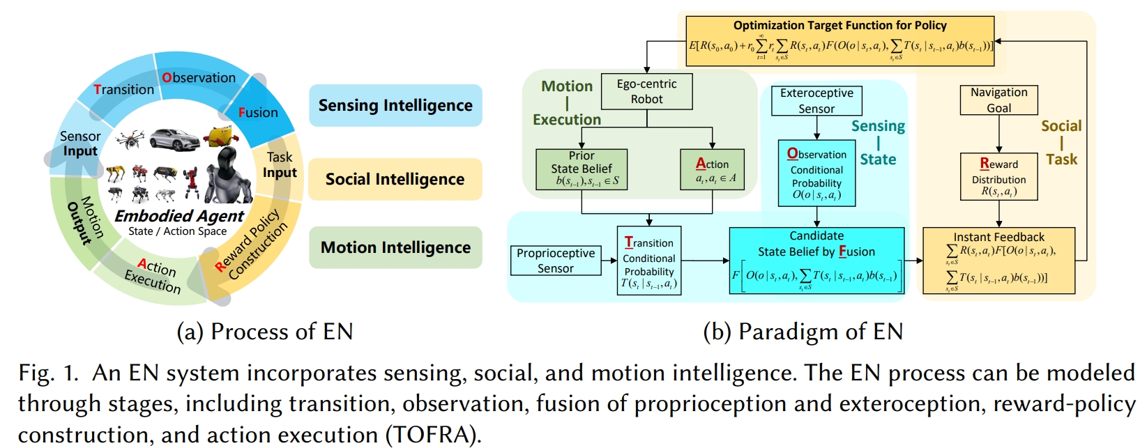 本博文对综述论文《Sensing, Social, and Motion Intelligence in Embodied Navigation: A Comprehensive Survey》阅读记录。 该论文对具身导航(Embodied Navigation (EN))中的感知智能、社会智能和运动智能全面综述。 将具身导航过程分解为五个关键阶段——状态转移(Transition)、环境观测(Observation)、信息融合(Fusion)、奖励策略构建(Reward-policy construction)和动作执行(Action),为具身导航研究提供了统一的结构化分析框架。
