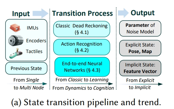 将来自本体感知(proprioception)和外部感知(exteroception)的信息进行融合,以形成最优的状态估计。主要是两种融合范式:经典贝叶斯方法(classic Bayesian methods)和隐式神经技术(implicit neural techniques)。