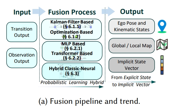 - 方法包括经典 贝叶斯滤波(如卡尔曼滤波、优化法),以及 神经网络隐式融合(如Transformer、多层网络),或二者结合的混合方法。