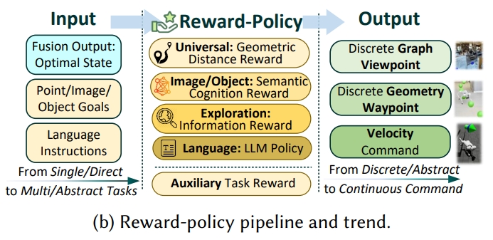 本section探讨在具身导航中,如何构建奖励函数和策略,以使机器人能够理解和执行高级任务指令。 通过将高层任务(high-level tasks)转换为奖励函数来指导策略学习。