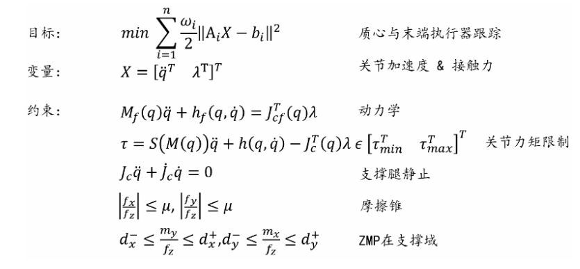 全身关节力控基于机器人完整的刚体动力学模型,将各个关节力矩的分配表达成一个优化问题:如下图,优化目标是减小质心和末端执行器轨迹的跟踪误差等用户需求,优化变量是关节的加速度和足底的接触力,约束包括符合动力学模型,满足关节力矩限制,符合支撑腿足底不动等物理假设,足底力满足摩擦锥要求以及ZMP(基于简化模型的零力矩点)在支撑域内保证脚掌不翻转等要求。优化得到的关节加速度和足底接触力再通过逆动力学就可以得到各个关节期望的前馈力矩。