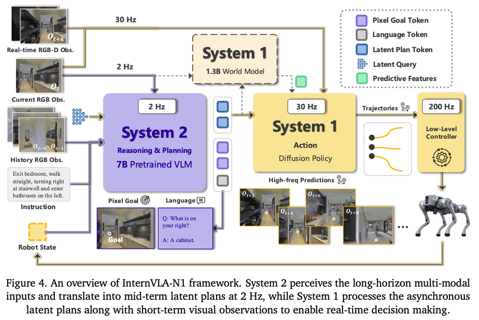 - 首个开源的基于快慢双系统的VLN基础模型。System 2 用于执行多轮的基于语言指令、观测(视角感知)的精确规划。而System1则是负责在真实世界环境下,执行System2输出的规划。其中,学习到的latent plans作为中间表示,来实现两个系统之间的交互;