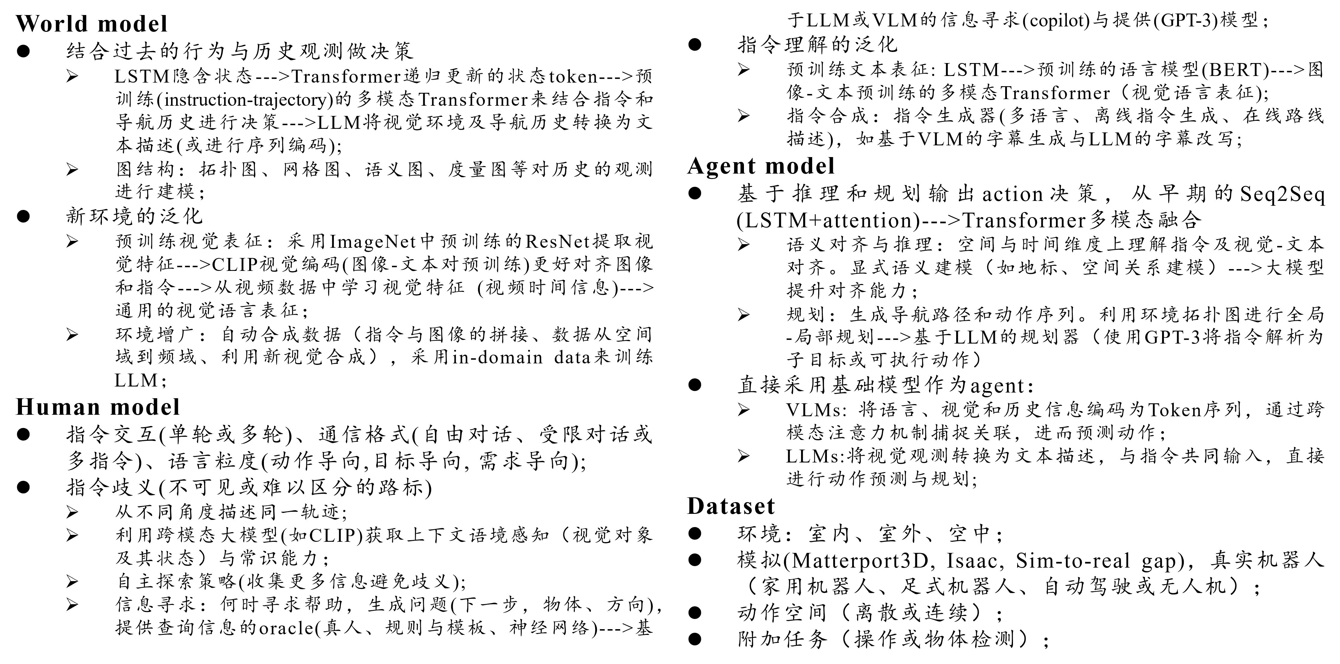此外,作者还引入了基于LAW(论文:Language models, agent models, and world models: The law for machine reasoning and planning)框架的系统框架,用于组织和理解VLN中的多模态推理和规划任务,强调了基础模型在构建世界模型和智能体模型中的作用。 作者,从world model、human model和VLN agent三个角度对VLN的挑战进行了分类,并提供了相应的解决方案。